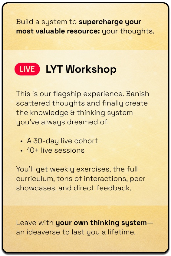 That’s pretty wild, because the core promise of the LYT Workshop is to “build your custom knowledge system”. It’s not to “think better”.